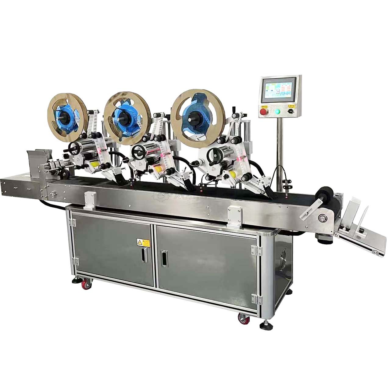 This 3-head hang tag paging labeling machine is a high-efficiency automatic labeling system, integrating automatic paging, feeding and triple-head labeling functions. It is specially designed for mass labeling on hang tags, cards, plastic bags, envelopes and other flat products, greatly improving production efficiency with its multi-station design.
