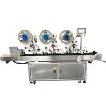 3-head hang tag paging labeling machine with automatic feeding, high-speed labeling for hang tags, cards, and flat products. PLC control, SUS304 frame, ±1mm labeling accuracy.