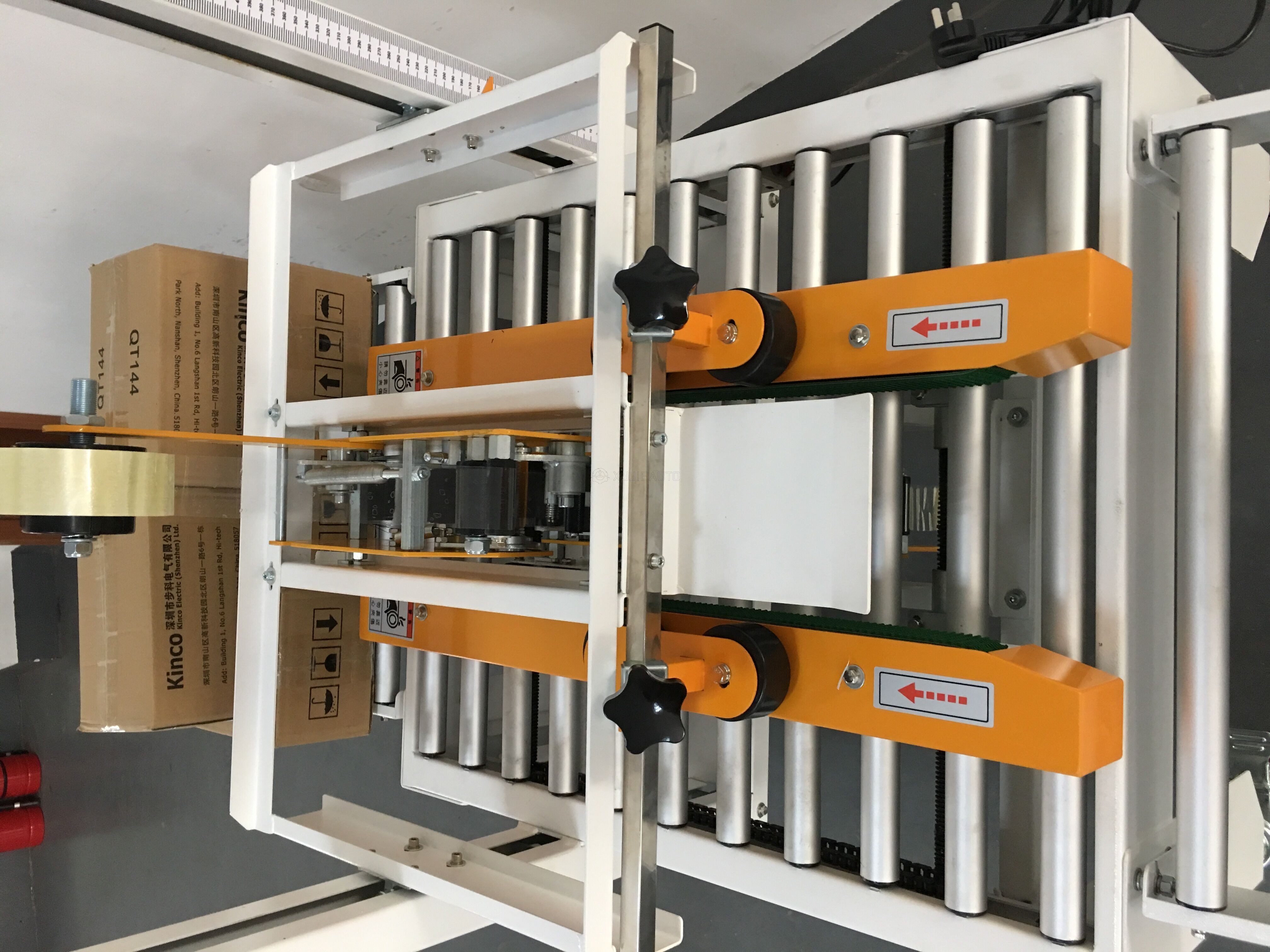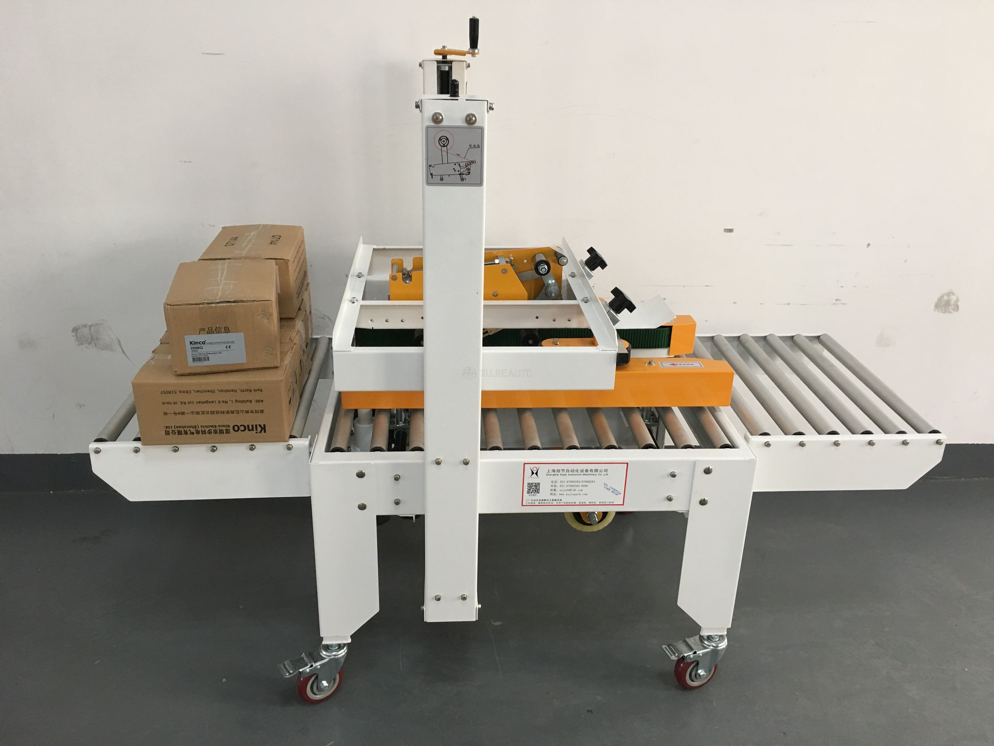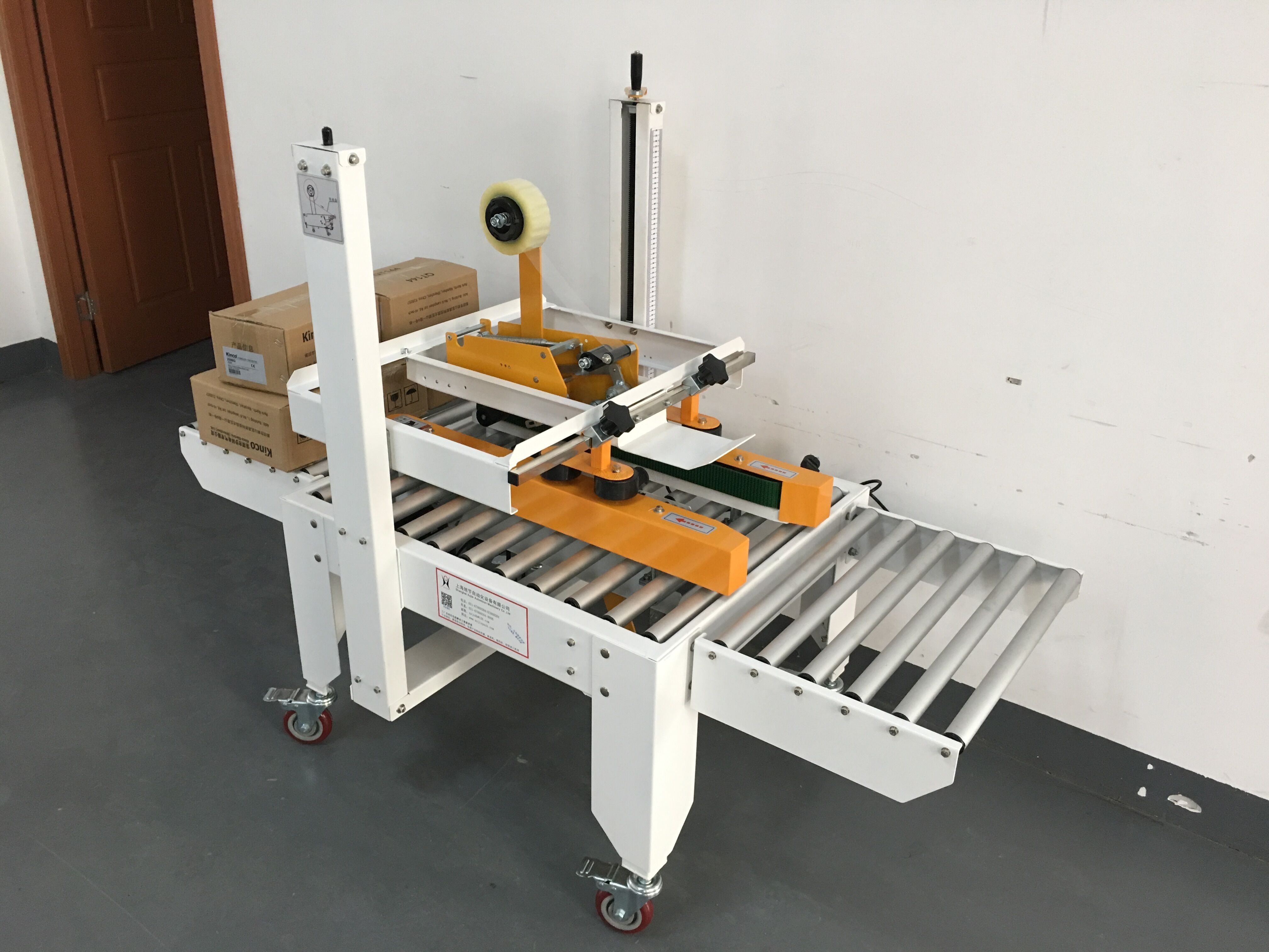 2.Adjust sealing height and width by hand according to the size of carton, then put carton on worktable, and carton will be transmitted through and sealed with tape automatically at the same time.