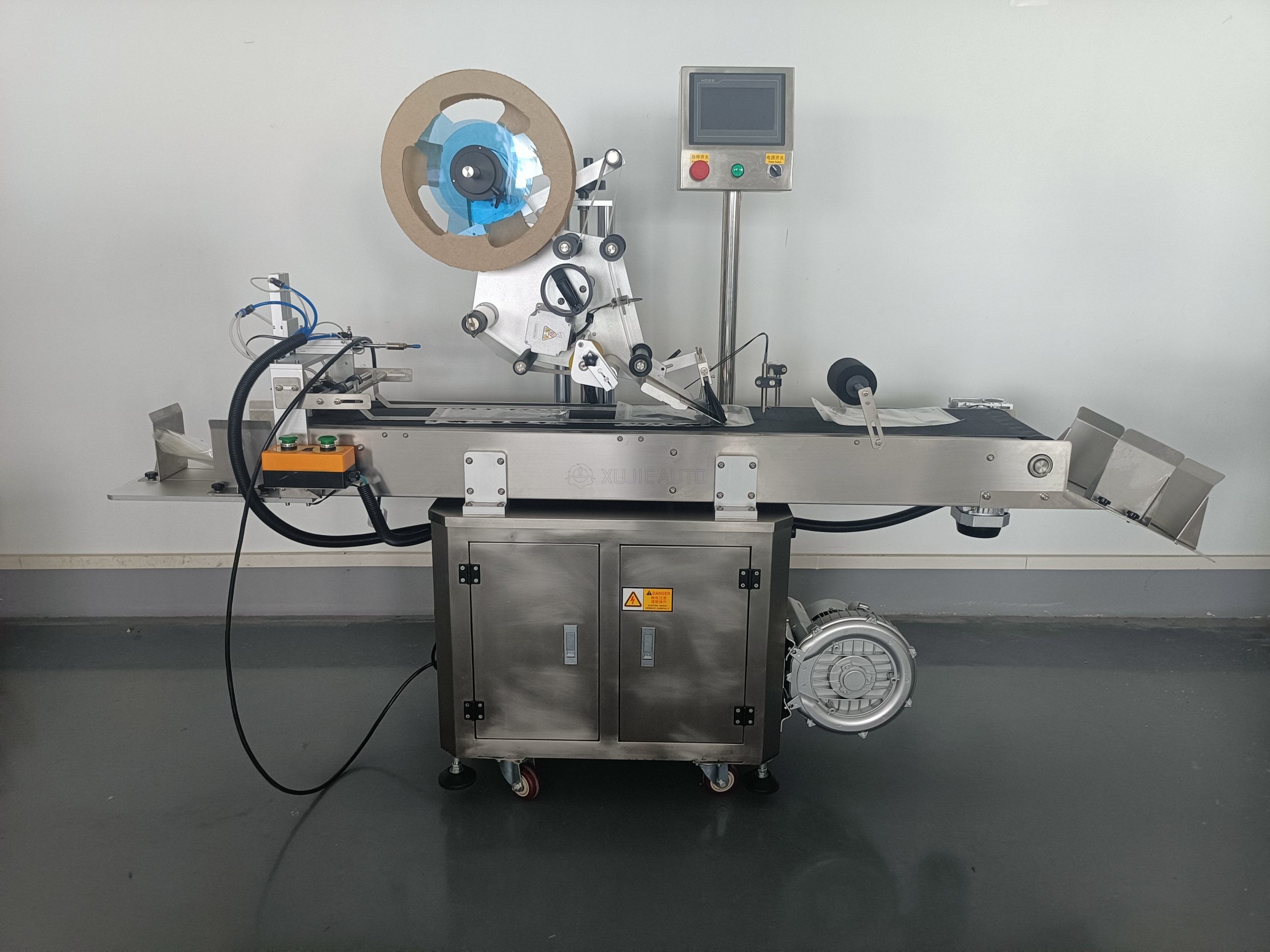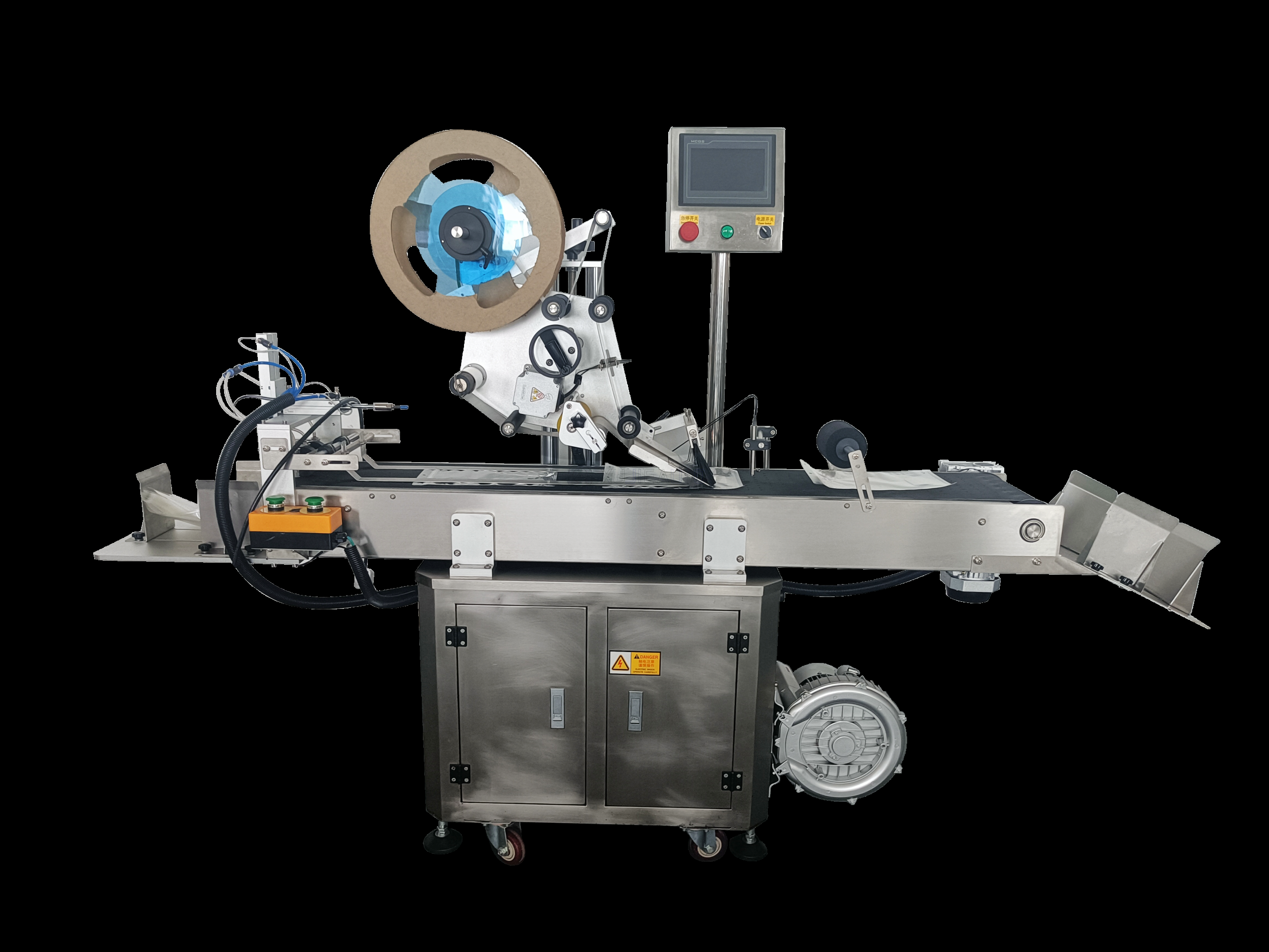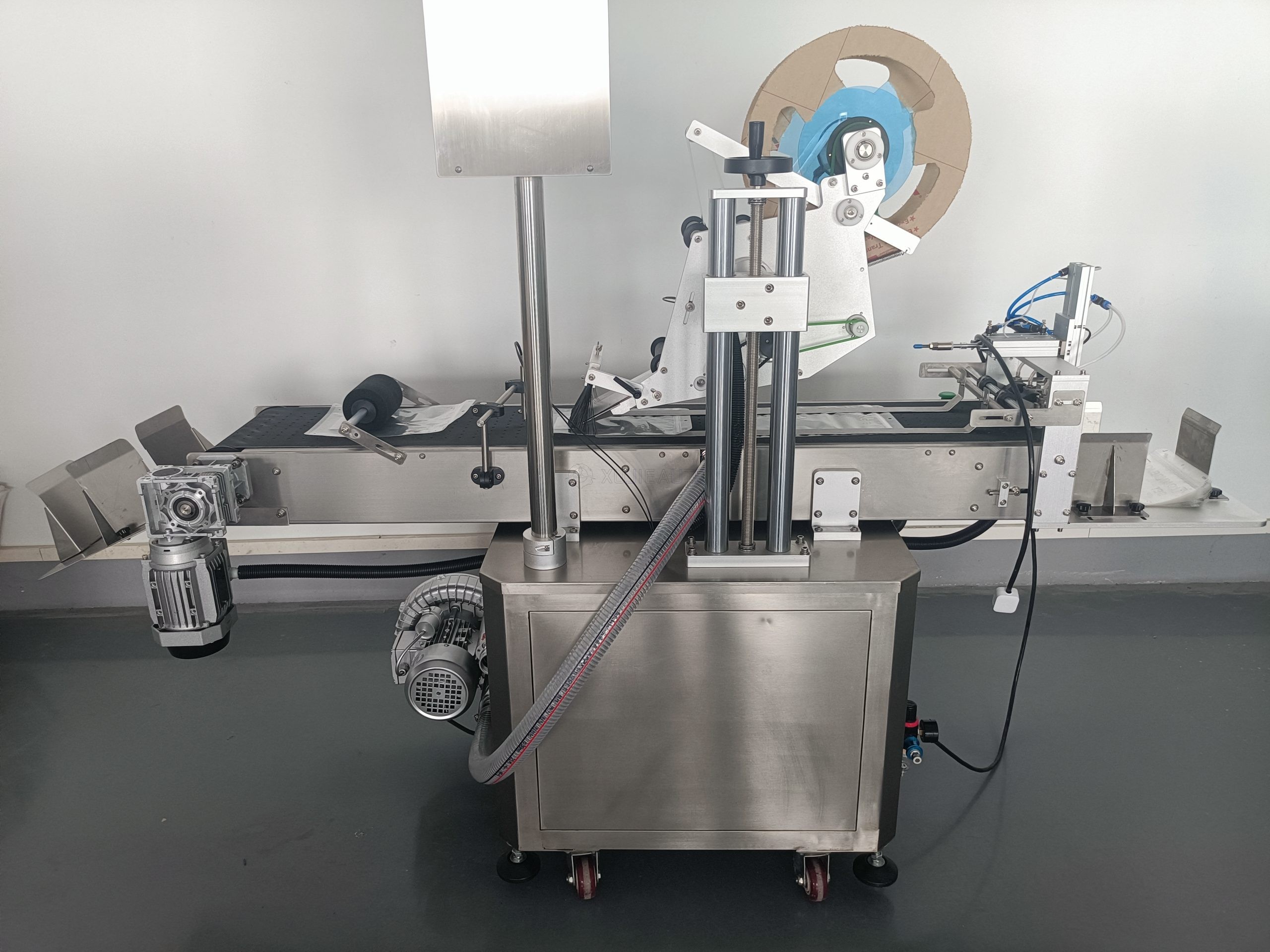 Equipped with a pneumatic-driven vacuum paging feeder, it automatically separates stacked products and feeds them into the labeling station for continuous, hands-free operation. The high-precision labeling head ensures ±0.5mm label placement accuracy, even at speeds up to 200 products per minute. Built with a SUS304 stainless steel frame and PLC touchscreen control, it is durable, easy to operate and meets hygiene standards for food, cosmetics, pharmaceutical and logistics applications. The modular design allows seamless integration with existing packaging lines, making it a cost-effective upgrade for high-volume production.